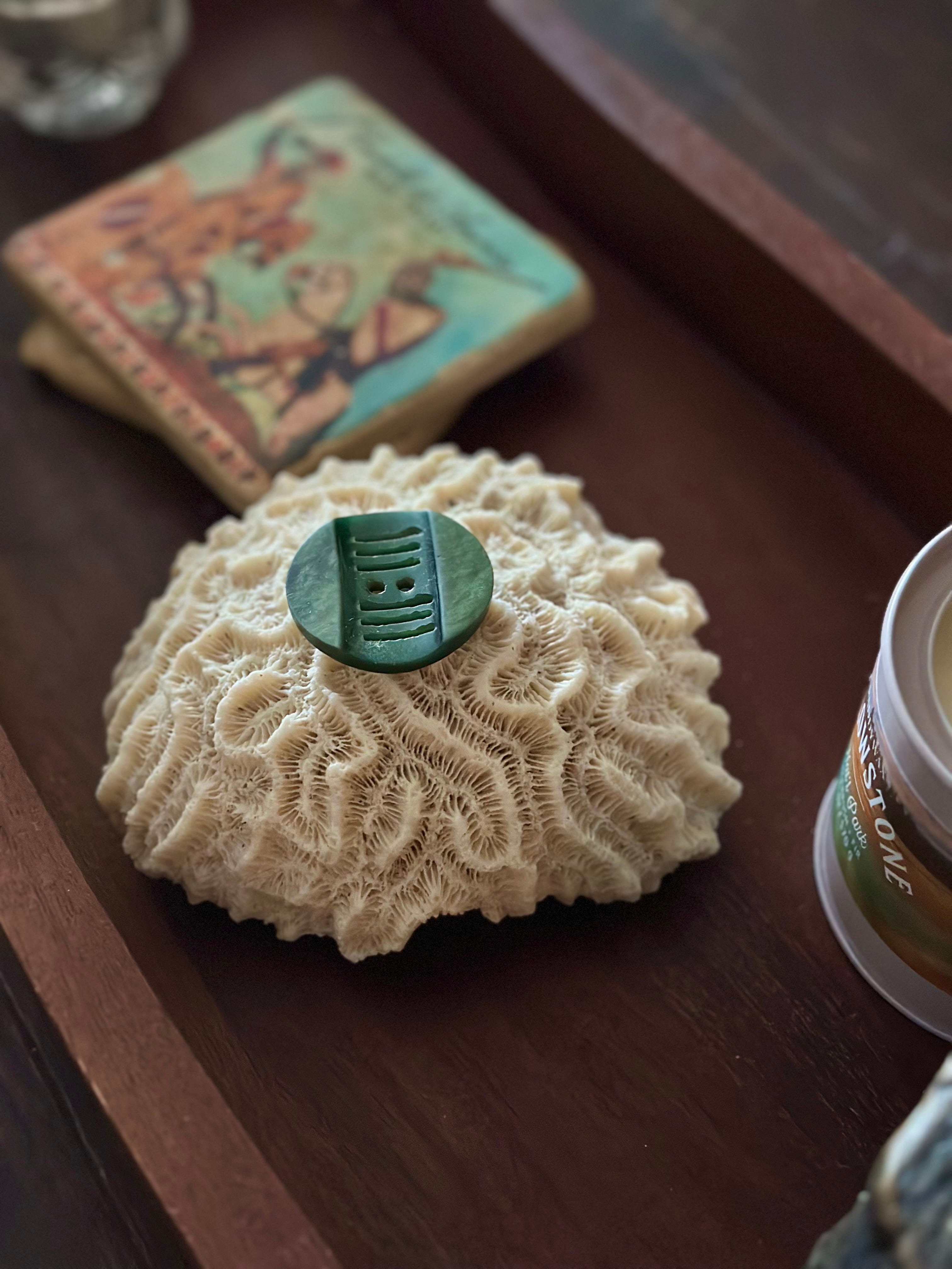This past summer I picked up a button from the tin and put it in my pocket like a seashell. The green button with an indentation, six parallel lines and two holes. And it traveled with me to the other side of the world. Now it sits on a piece of brain coral on our coffee table. And I look at it most days and remember Grandma.