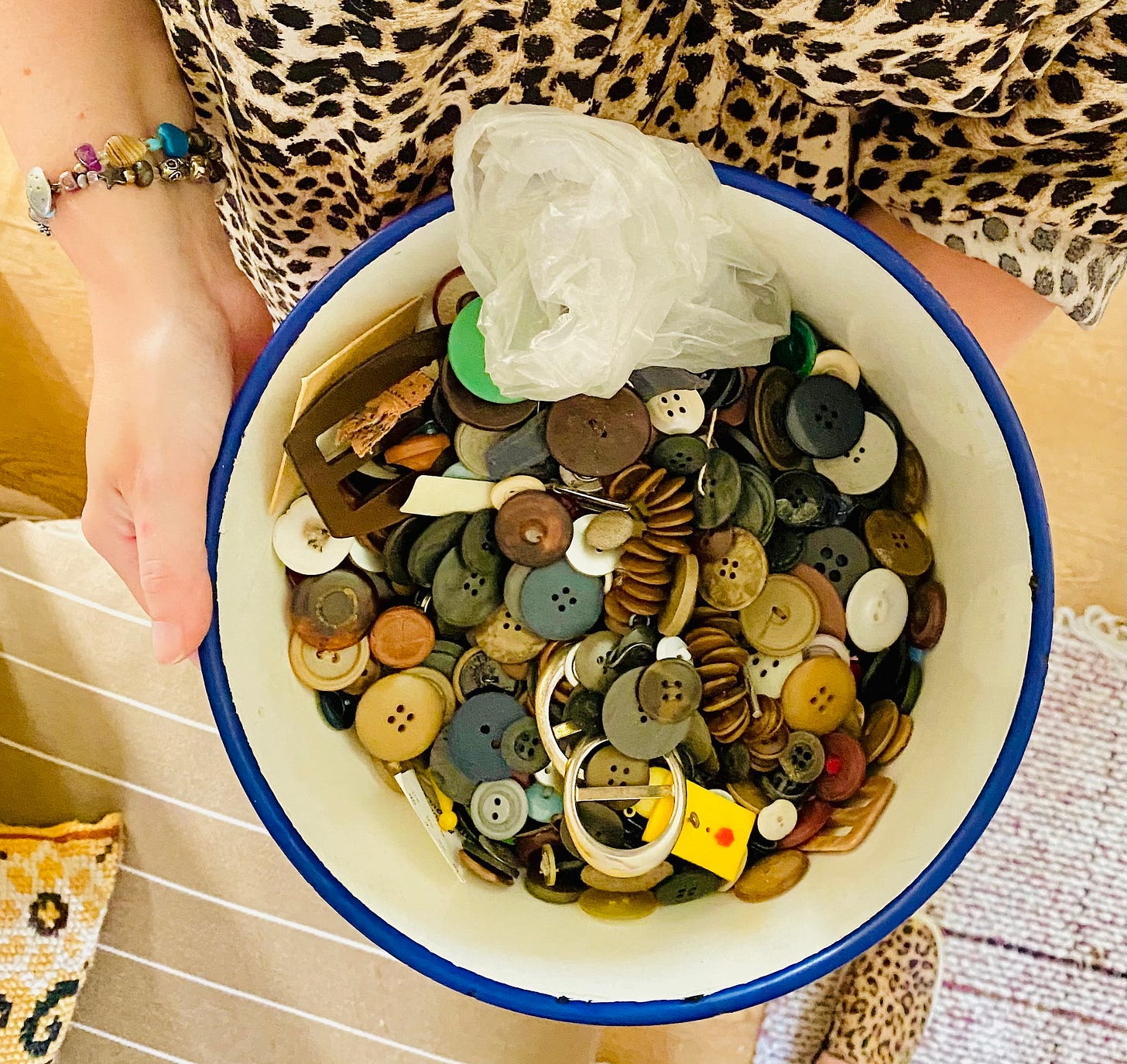 Every time I visit my childhood home I pop by her house and walk through the rooms that still hold many of her belongings. The button tin is kept in an ornate cabinet made of dark solid wood. One of those with an oval mirror in the middle. There it is, frozen in time. All the buttons have at one time been touched by her hands. Somehow selected and made it into this enamel bowl. Now they look so — earthen? Sometimes, as a child, some of the buttons were colorful. Perhaps they got used over the years until only the earthen colors remained?