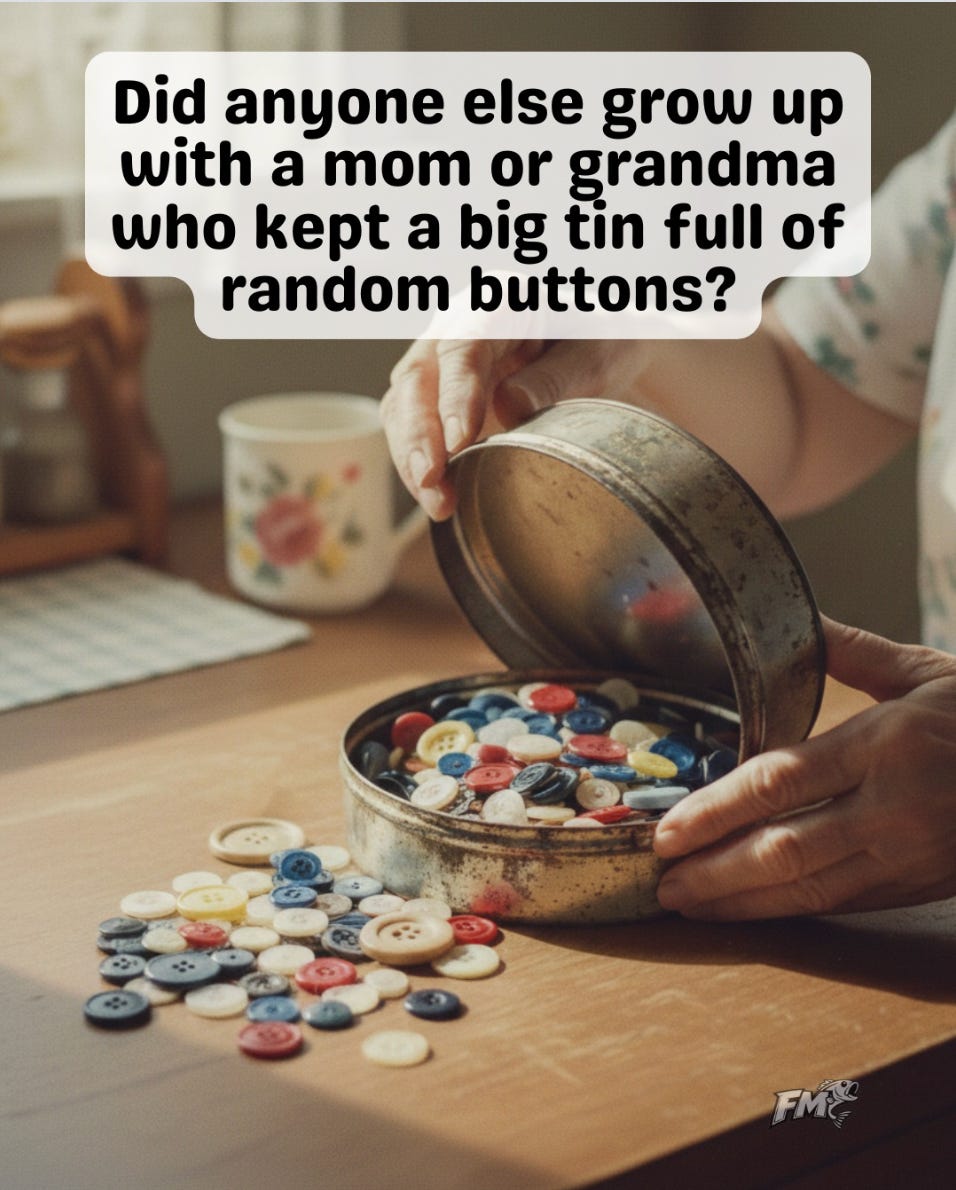 It began with me stumbling on this Instagram meme, reposting it, and receiving comment after comment about how their grandmother also had the same exact collection of buttons, in a tin. And it didn’t matter where we grew up; we all seem to have had the same Grandma! Several followers from all over the world immediately told me they have carried on the button tin tradition and how they never throw away a stray button. How they would play with the buttons, endlessly, as children (often before the Internet existed). And how the stray button that comes into their lives goes into the button tin, just as it did for their own dear grandma, for a future time when said button might or will be needed. For that day may come! And you can never predict it. The button collection is a game of patience.